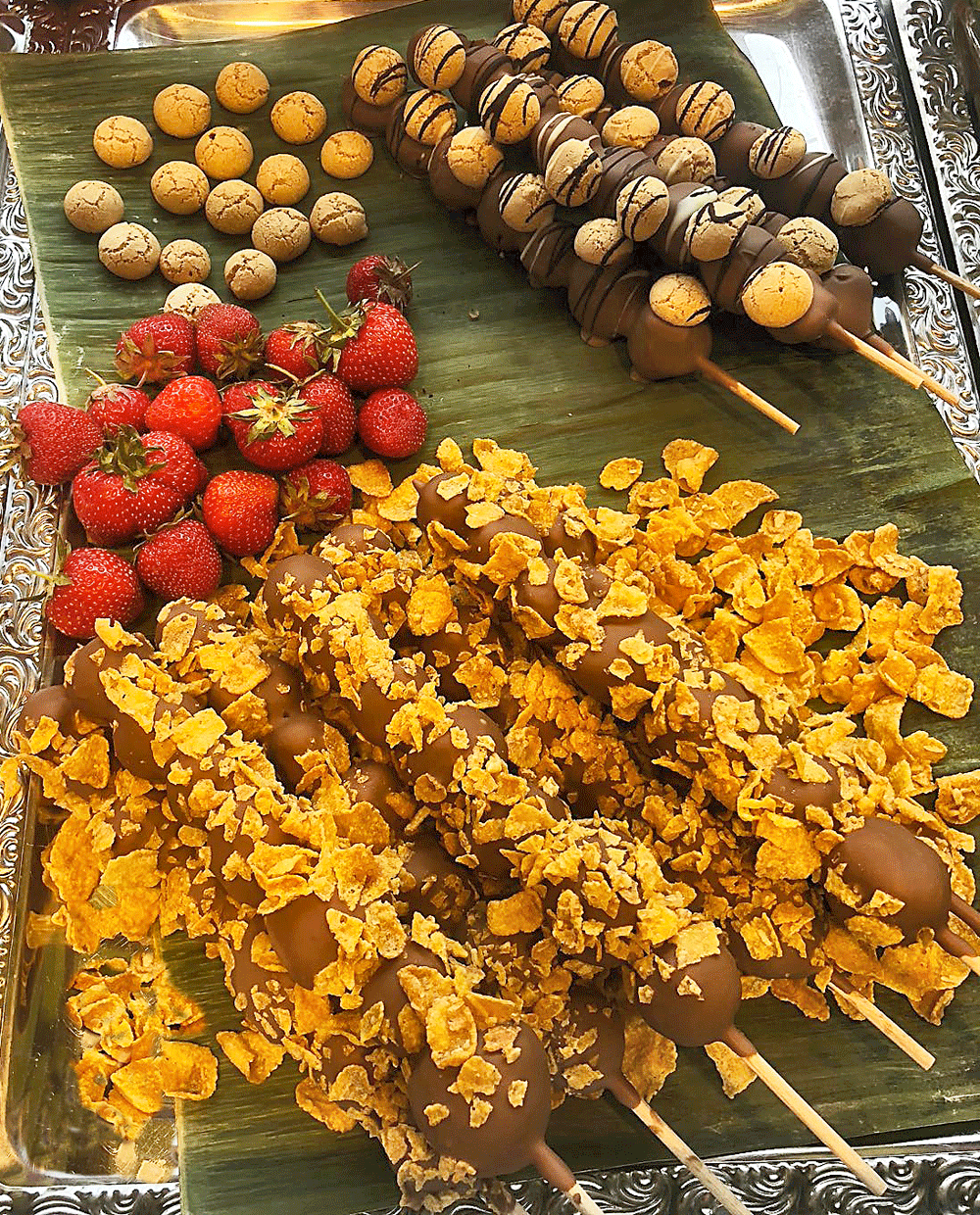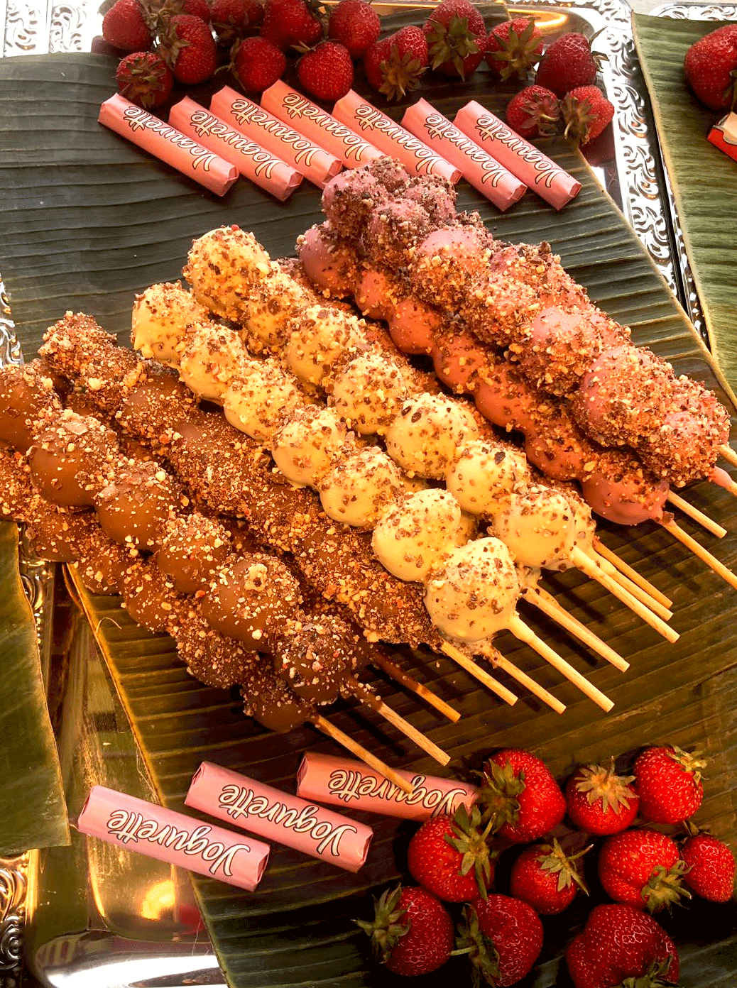 Feinste Schokoladenfrüchte: Erdbeeren, Ananas, Trauben, Banane, Apfel, Birne, Orangen, Kiwi, exotische Früchte – veredelt mit feinster Pralinenschokolade.